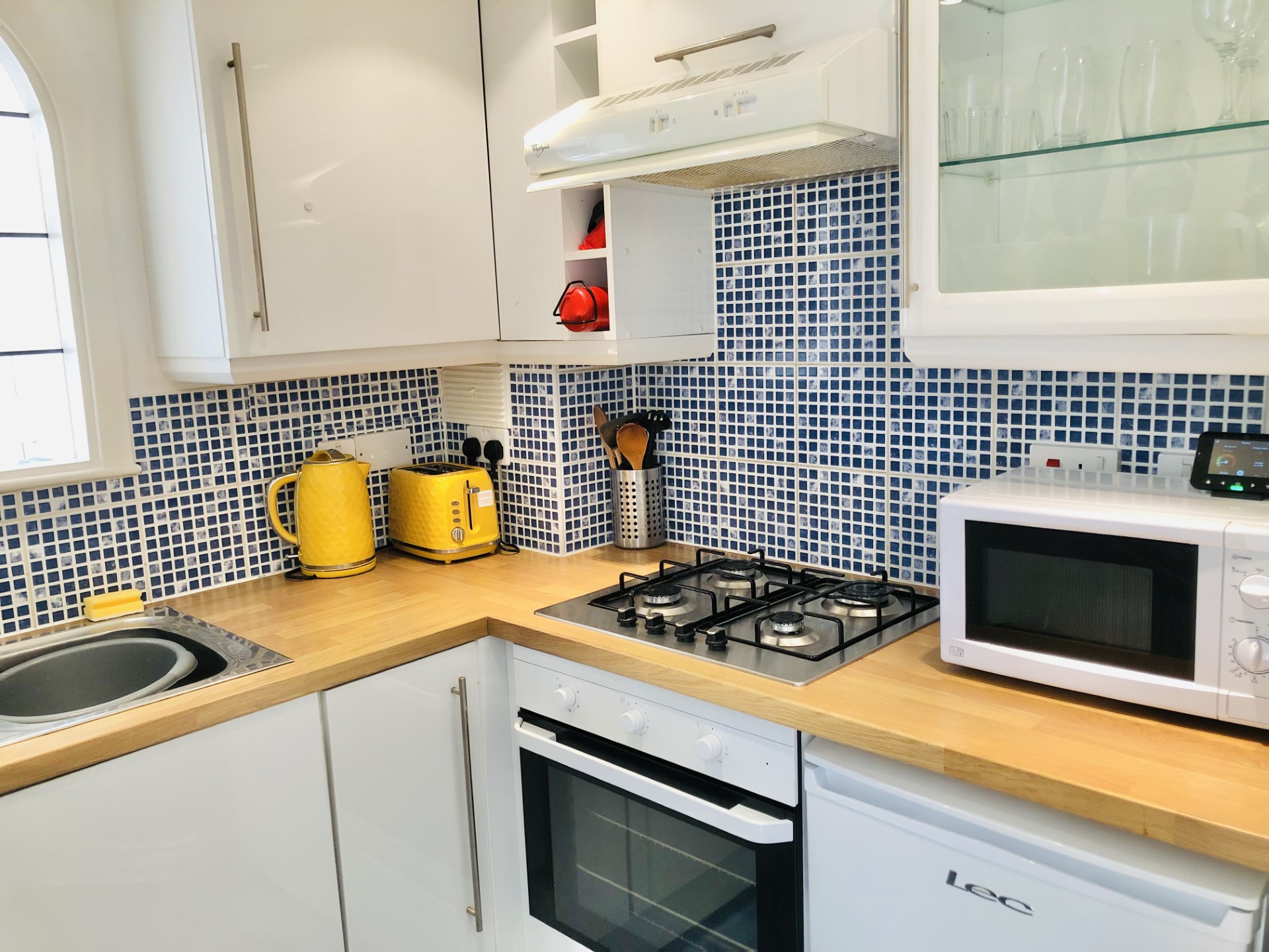 Fully equipped kitchen with washing machine, hob, oven and microwave